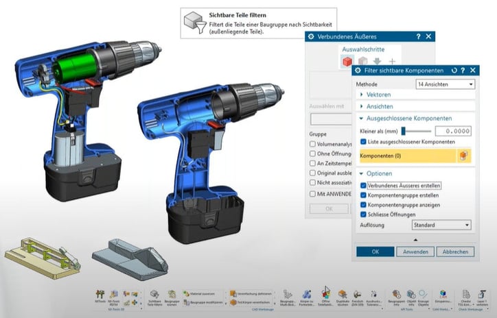 Neben hoher Performance auch Funktionen zur gezielten Vereinfachung von Baugruppen – etwa durch das Aufwickeln von Baugruppen oder die Erstellung eines verbundenen äußeren Volumens. Diese Methoden ermöglichen es, Hüllenmodelle für Bauraumuntersuchungen zu erzeugen oder sensible Details zu verbergen, um geistiges Eigentum zu schützen. Ergänzend dazu bietet das Presales-Tool „sichtbare Teile filtern“ eine moderne, flexible Alternative zur klassischen Hüllenbildung – ideal für Anwender, die regelmäßig mit vereinfachten Darstellungen arbeiten. Entwickelt wurde das Tool speziell für den praktischen Einsatz in Presales- und Engineering-Szenarien.