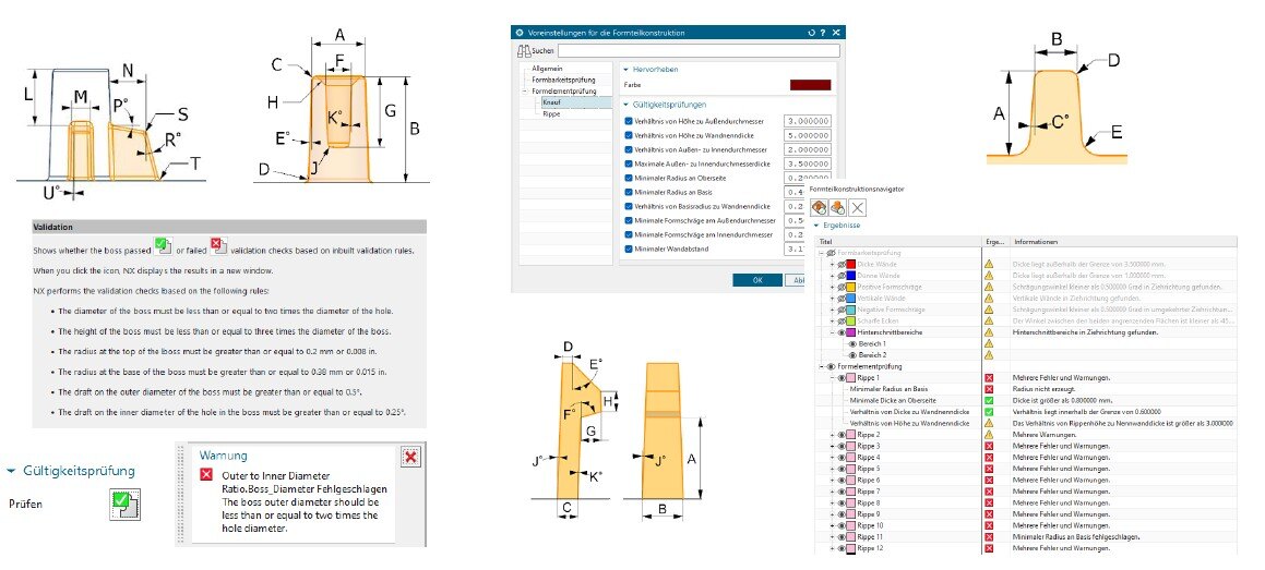 Dieses Werkzeug bietet umfassende Unterstützung sowohl beim Entwurf als auch bei der Validierung von Bauteilen. Sobald beispielsweise typische konstruktive Elemente wie Dome, Rippen oder Verstärkungen modelliert werden, liefert das System in Echtzeit Rückmeldungen zu deren Auslegung. So erhalten Sie direkt visuelles Feedback zur Entformungsschräge, zu Rippenhöhen, Wanddickenverhältnissen oder Stabilitätskriterien – und das unmittelbar im Konstruktionsprozess.