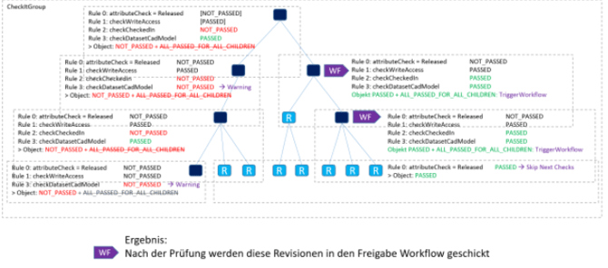 Für alle Komponenten startet nach der Prüfung automatisch ein Freigabeworkflow, sofern alle Prüfungen für die Baugruppe selbst, aber auch deren Kinder keine Fehler mehr aufweisen.