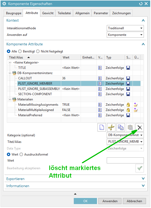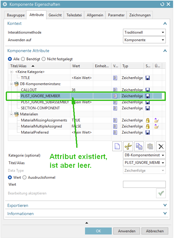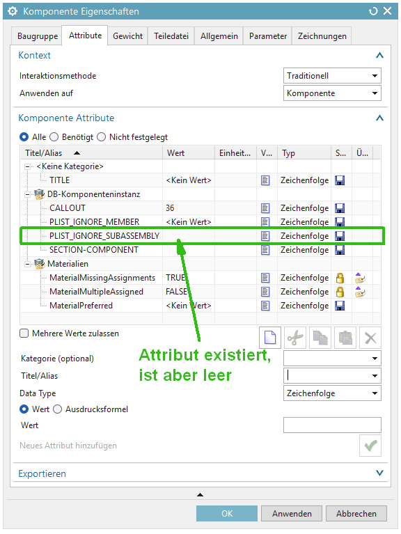 - Bei PLIST_IGNORE_MEMBER und PLIST_IGNORE_SUBASSEMBLY bleiben die Attribute sichtbar, zeigen als Wert aber <Kein Wert> an. Das Attribut ist NX dann zwar bekannt, wird aber in dieser Komponente nicht verwendet.