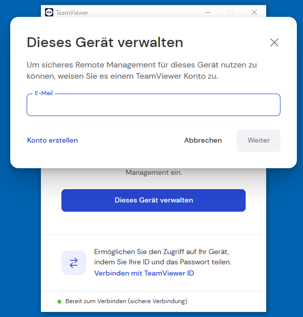 Jetzt die E-Mailadresse des Teamviewer-Kontos angeben und danach das Passwort angeben.
