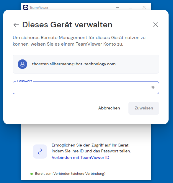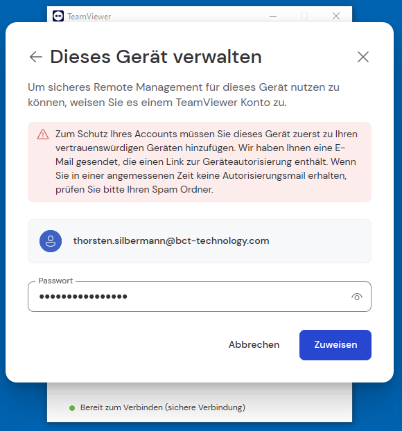 Wenn das Gerät über den Link in der Mail als vertrauenswürdig festgelegt wurde, dann im Teamviewer-Dialog auf Zuweisen klicken, dann sieht es so aus: